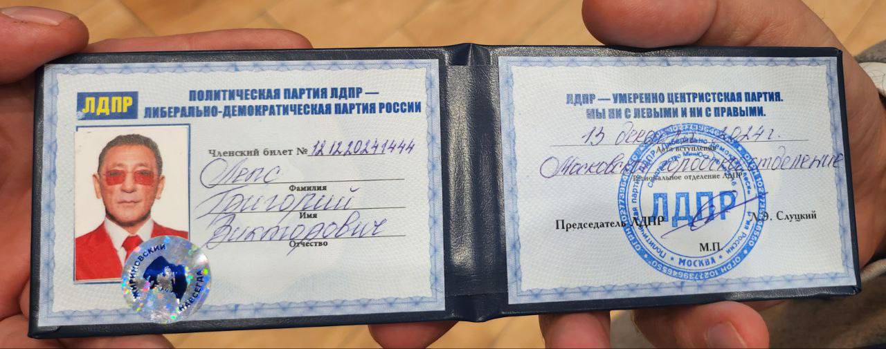 Председатель ЛДПР Леонид Слуцкий вручил партбилет народному артисту Григорию Лепсу. На документе, датированном 13 декабря 2024 года, наклеен значок «Жириновский навсегда».