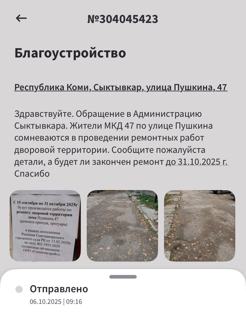 Согласно информации городских властей, ремонтные работы компания "Спецкомстрой" должна была начать уже 15 сентября и завершиться к 31 октября 2025 года. Однако, середина октября на исходе, а во дворе не видно ни малейших признаков подготовки к работам.