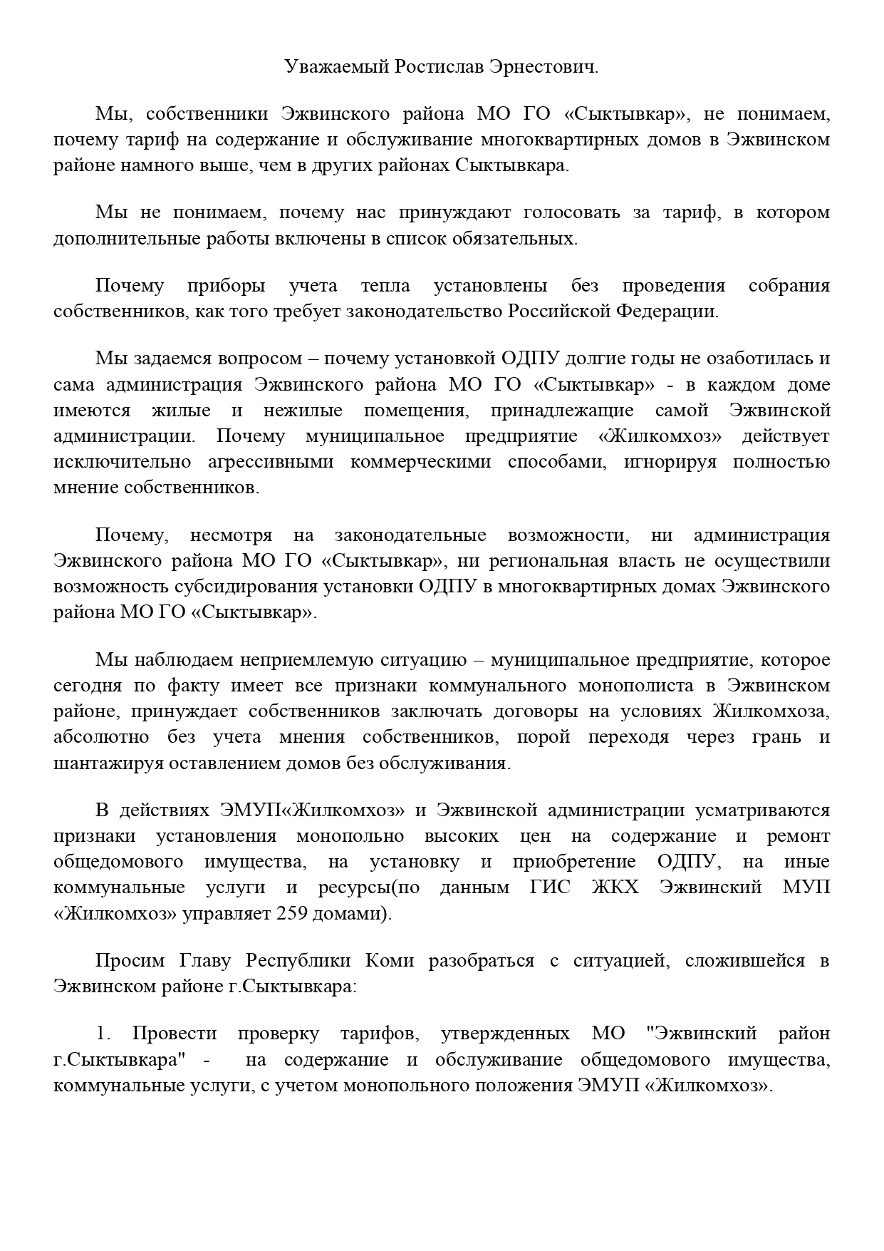 В обращении к Главе Республики Коми собственники задают ряд острых вопросов: