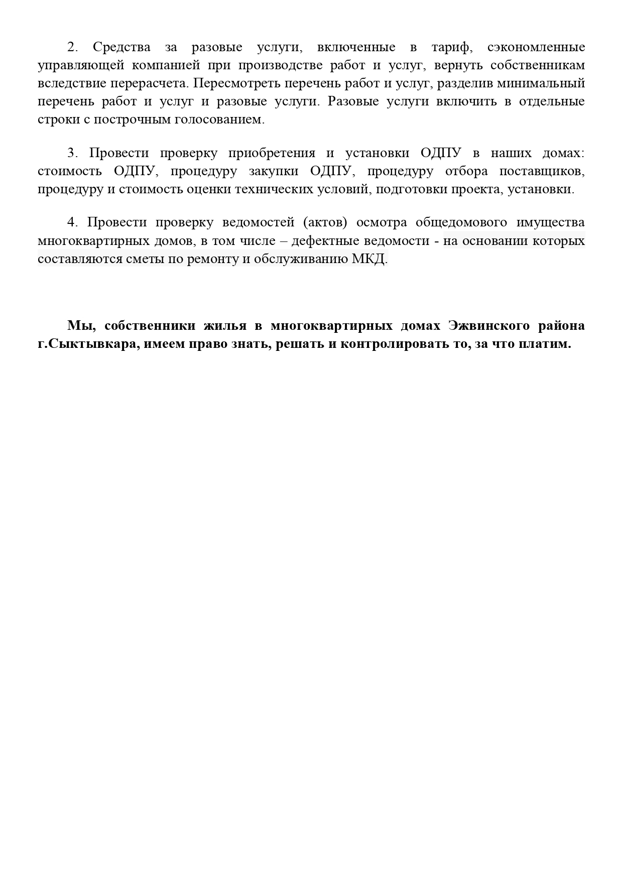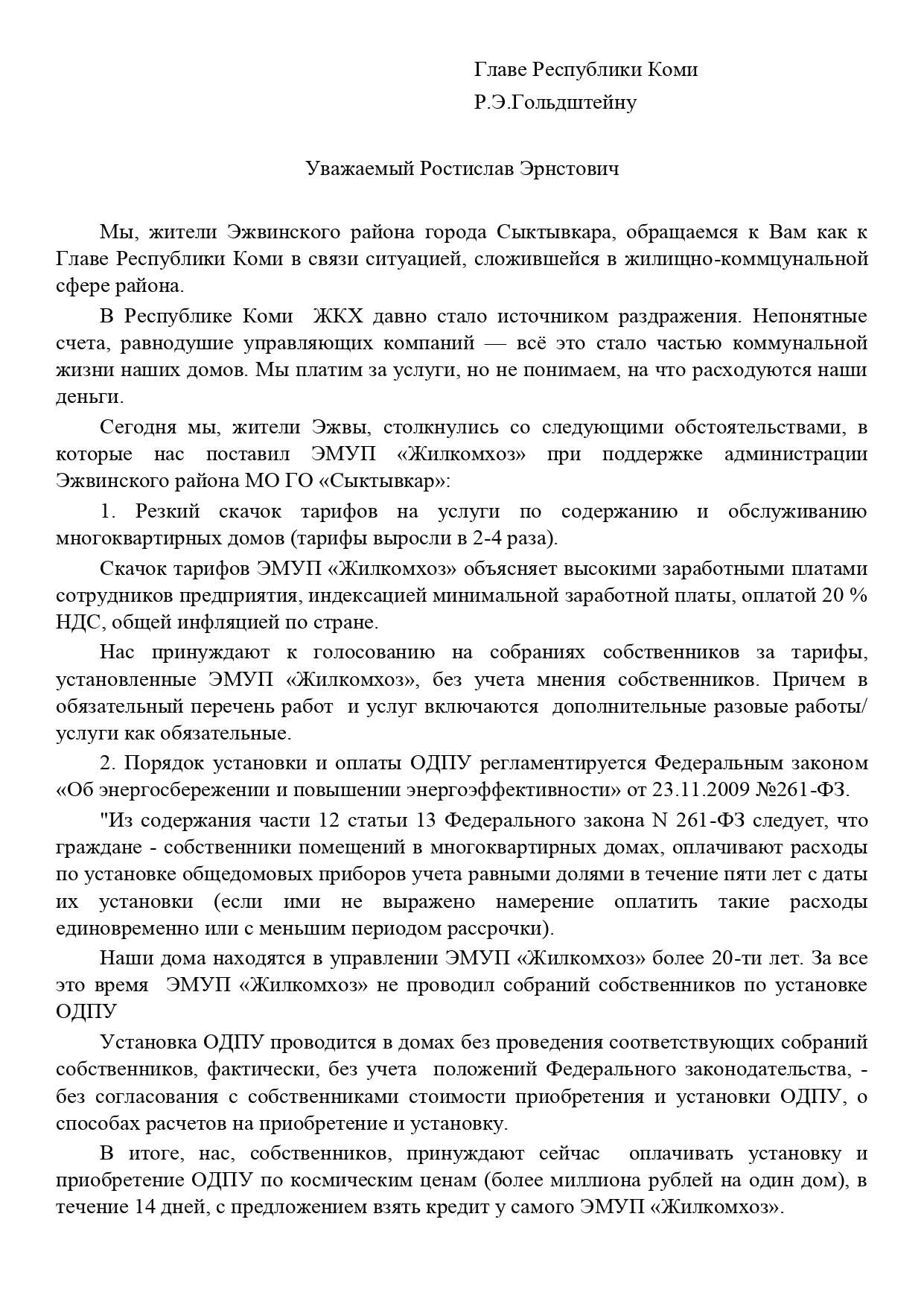 «Мы, собственники жилья в многоквартирных домах эжвинского района г. Сыктывкара, имеем право знать, решать и контролировать то, за что платим», — заявляют авторы обращения.Теперь решения этих вопросов жители Эжвы ждут от республиканских властей, и непосредственно – от Главы Коми Ростислава Гольдштейна.